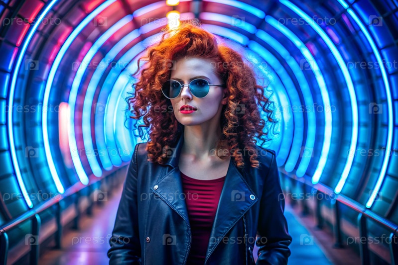 Молодая стильная красивая девушка в солнцезащитных очках стоит в неонном туннеле среди неоновых вывесок