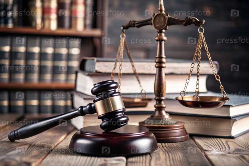 Древесный молоток, книги и весы на столе