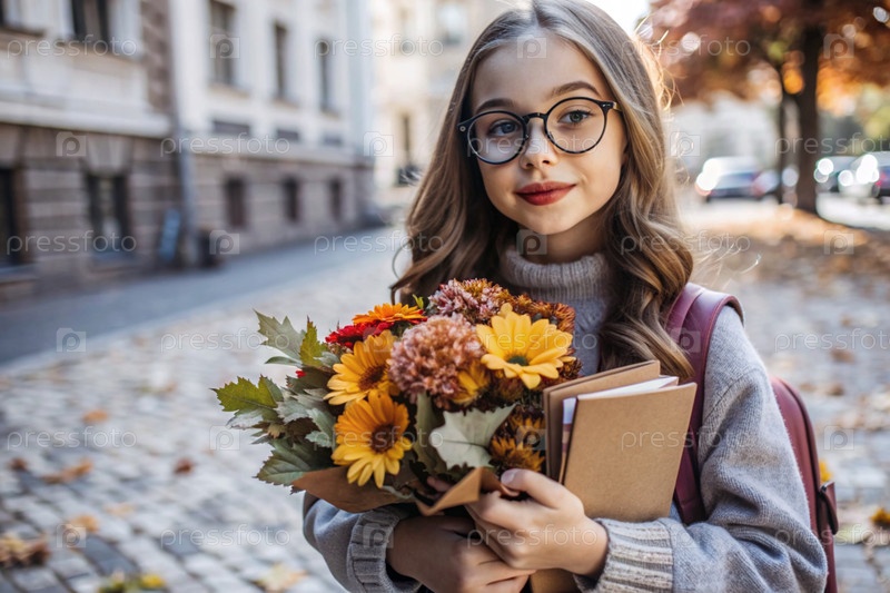 Красивая девушка с очками и букетом осенних цветов впервые идет в школу. Ребенок со школьной сумкой, книгой и цветами. Малыш на городской улице