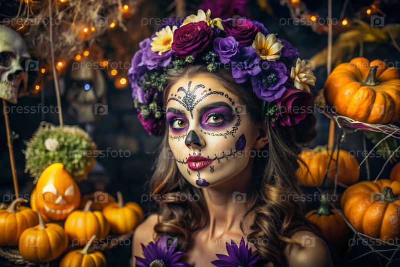 Концепция Хэллоуина. Ужасно. Костюмированная вечеринка. Красивая женщина с покрашенным черепом на лице и цветами на голове. Баннер, открытка