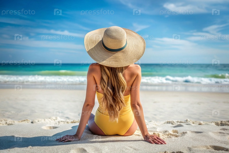 Женщина на отдыхе, сидящая в купальнике и соломенной шляпе с широкими краями на пляже в солнечный день и смотрящая на море