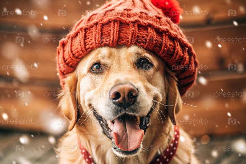 С Новым годом и Рождеством! Падает снег. Веселая собака-золотой ретривер сидит в вязанной шляпе. Золотой ретривер ждет праздника