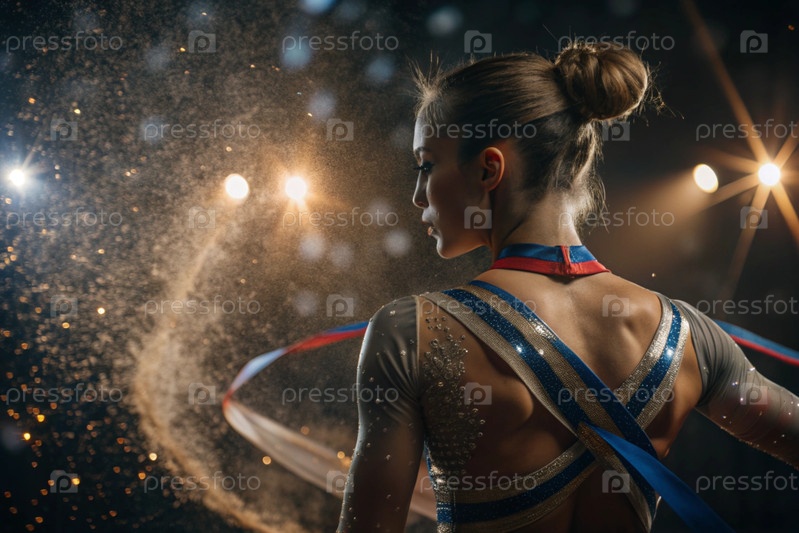 Ритмическая гимнастика - это крупный план красивой гимнастки с лентой в центре внимания на спортивной арене