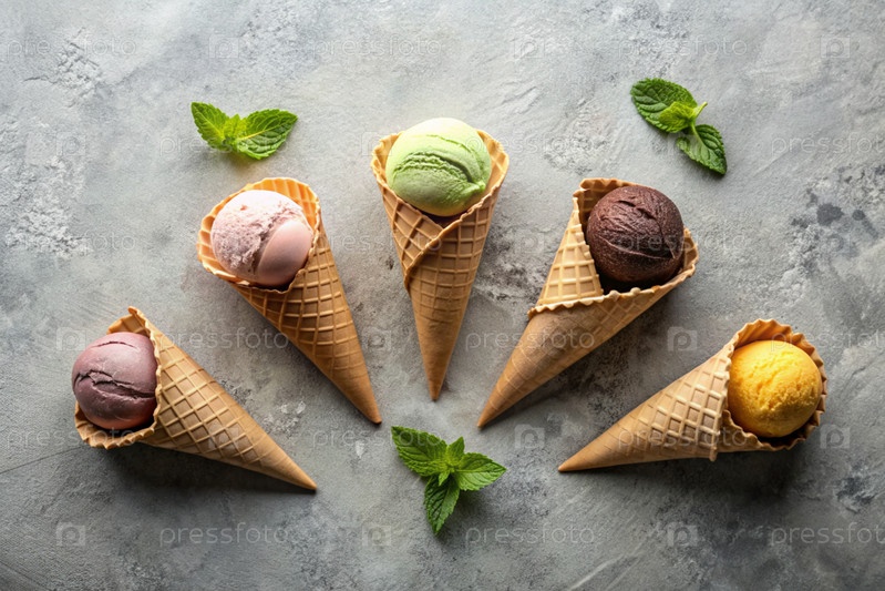 сладкий десерт. морозильные шишки с различными вкусами на бетонном сером фоне. Всемирный день мороженого