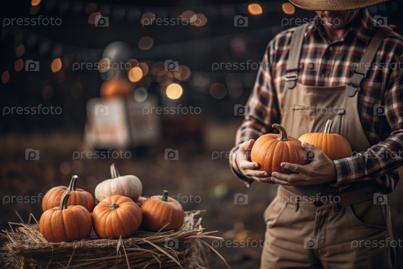 Руки мужчины в квадратной рубашке с тыквенным крупным планом и красивым осенним рисунком. Сбор тыков. Концепция празднования Дня благодарения и Хэллоуина