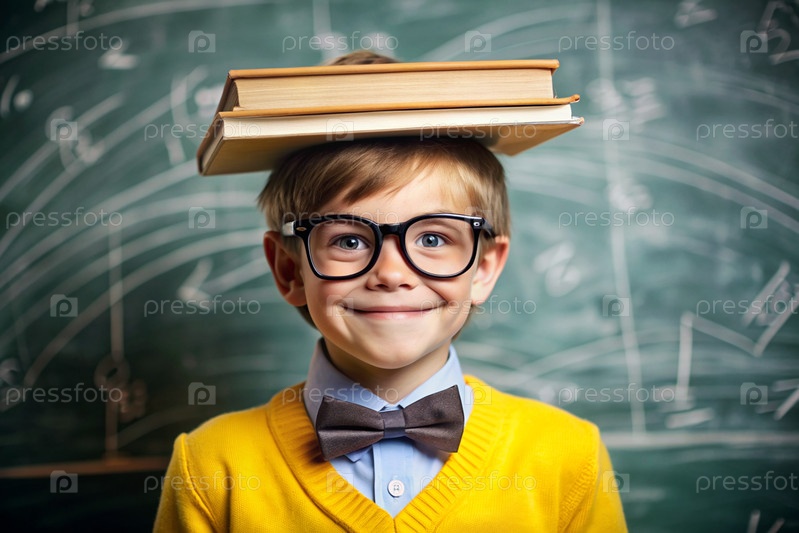 Милый мальчик с очками и книгами на голове. Ребенок впервые идет в школу. Ребёнок в классе с доской на заднем плане. Возвращение к школе