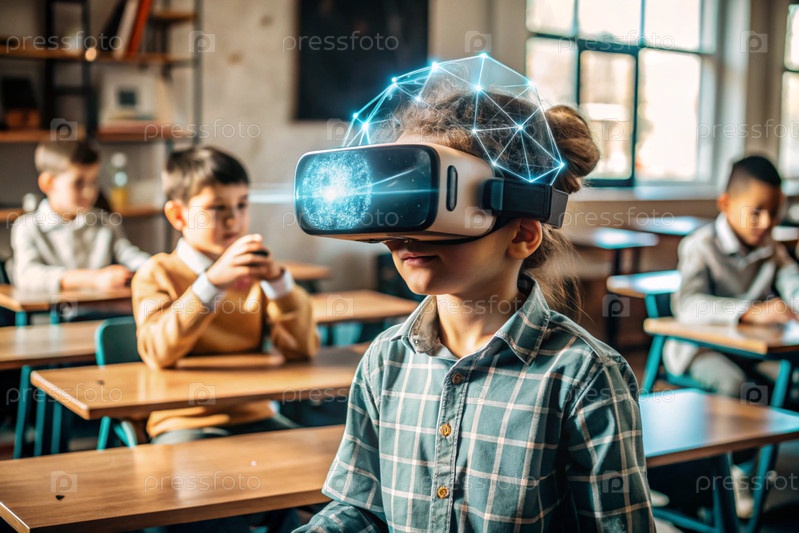 Мальчик с очками виртуальной реальности. Ребенок находится в классе, а другие ученики на заднем плане. Цифровой интерфейс отображается в наушниках