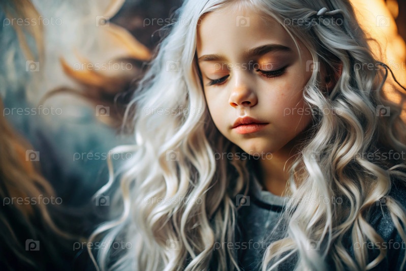 Портрет красивой маленькой блондинки с длинными волнистыми волосами и вдумчивым взглядом.Волосы развиваются и создают ощущение легкости и естественности