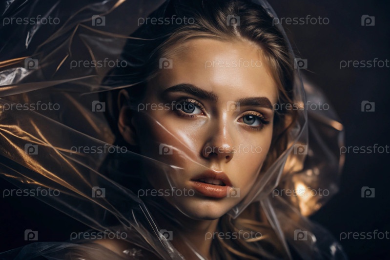 Девочка завернута в целлофан или сумку. Девушка задыхается. Пластиковое загрязнение планеты. Опасность для окружающей среды. Сокращение повторного использования пластика. Переработка. Концепция мусора