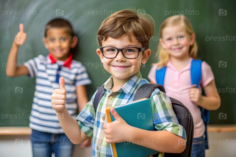 Мальчик с очками показывает класс своей рукой. Ребенок впервые идет в школу. Ребёнок со школьной сумкой и книгой. Ребёнок в классе с доской на заднем плане. Возвращение к школе