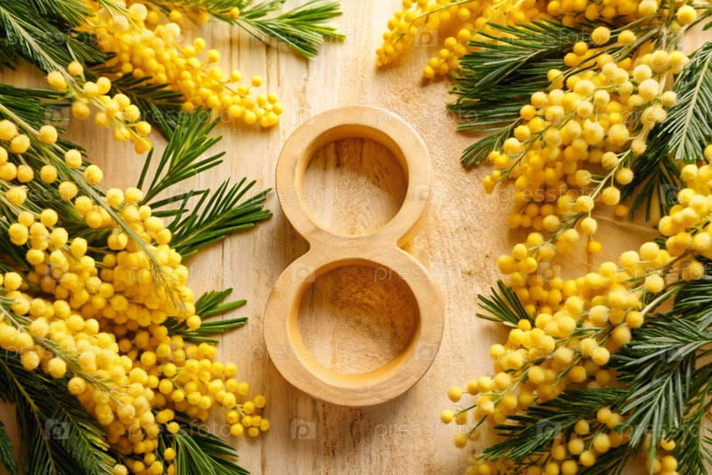 Международный женский день. баннер, флаер, красивая открытка на 8 марта. желтые цветы мимоза и число восемь на деревянном фоне