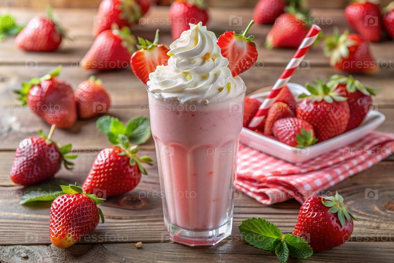 Освежающий клубниковый молочный коктейль с битой сливкой и соломой на столе, окруженном свежими ягодами