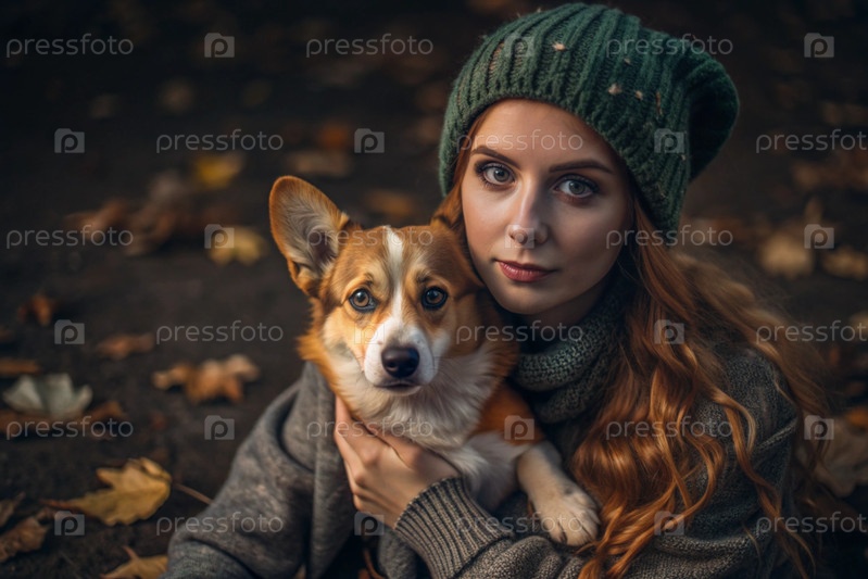 Женщина обнимает валлийскую собаку Корги в осеннем парке.Сознательная жизнь с домашним животным, концепция дружбы и любви к животным