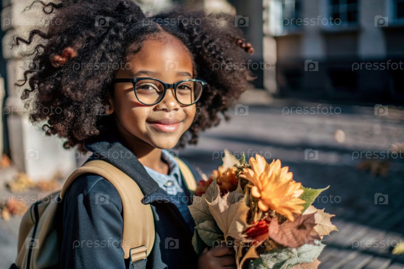 Красивая афроамериканка на очках с букетом осенних цветов впервые идет в школу. Ребенок со школьной сумкой, книгой и цветами. Малыш на городской улице