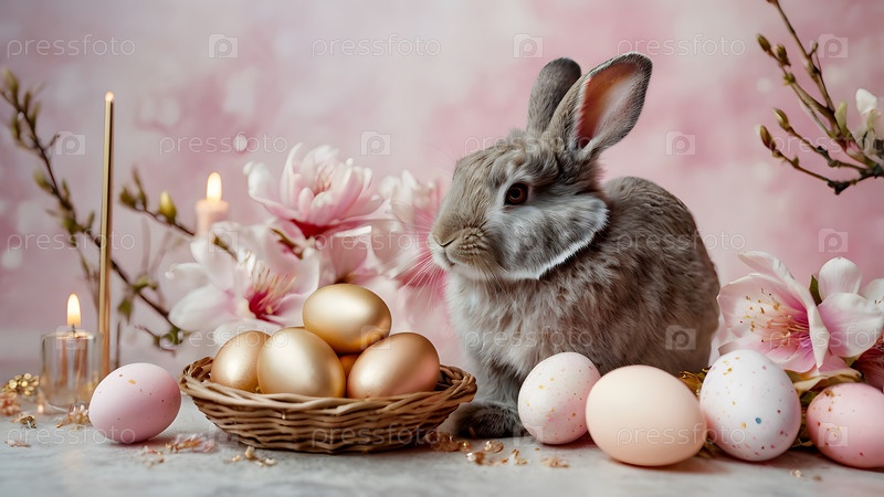 Концепция яркого пасхального праздника: нежные пасхальные яйца в корзине из колючки, кролик и деликатные розовые цветы на пастельно-водном фоне