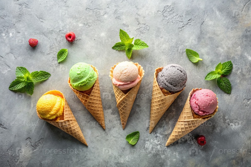 сладкий десерт. морозильные шишки с различными вкусами на бетонном сером фоне. Всемирный день мороженого