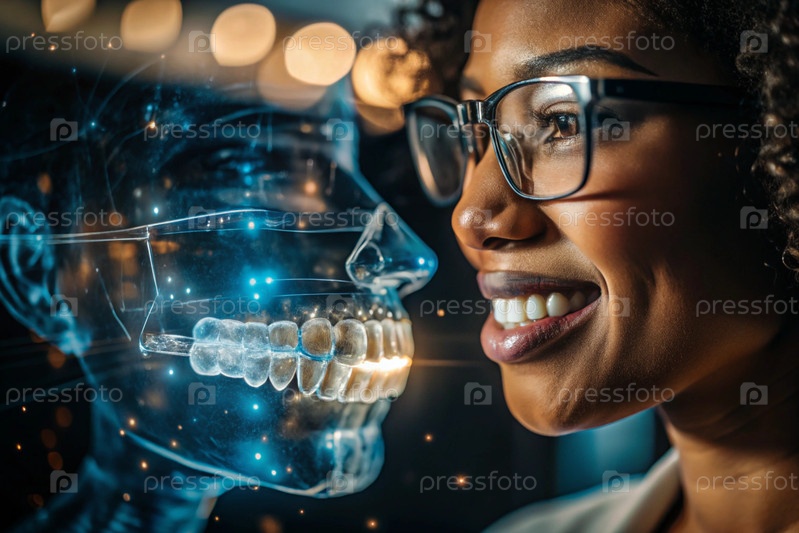 Новые технологии цифрового искусственного интеллекта в зубных протезах. Имплантаты. Чернокожая женщина-стоматолог с идеальной улыбкой и цифровой стоматологической графикой на виртуальном экране. Концепция здоровья зубов и ухода за зубами