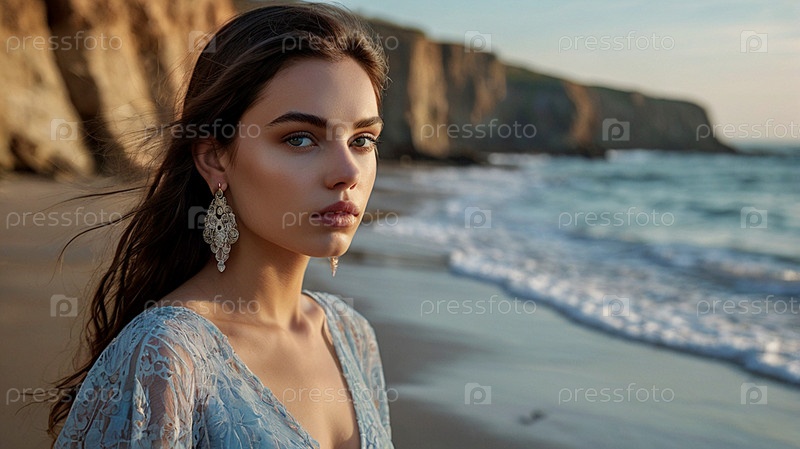 Портрет красивой женщины на пляже перед морем.Романтическая, спокойная и чувственная фотография девушки в проветренном нежном платье
