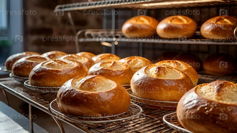 Печьте хлеб на фабрике. Свежий вкусный хлеб в пекарне. Свежевыпеченный кисломолочный хлеб с золотой корой на фабрике. Контекст пекарни со вкусным хлебом