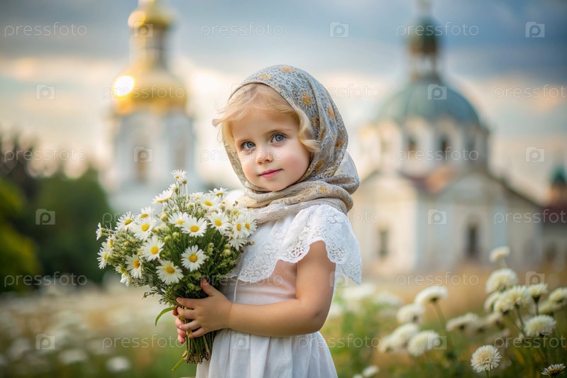 Всероссийский день семьи, любви, верности. красивая маленькая кудрявая девочка в русском шале с букетом ромашки на фоне православной церкви. День святого Валентина Петра и Февронии