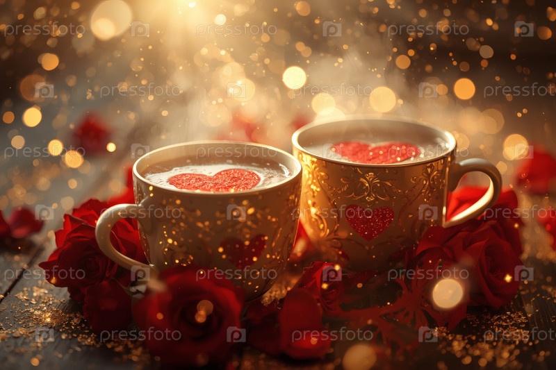 Чашки горячего кофе или чая, окруженные красными цветами и сердцами в День святого Валентина