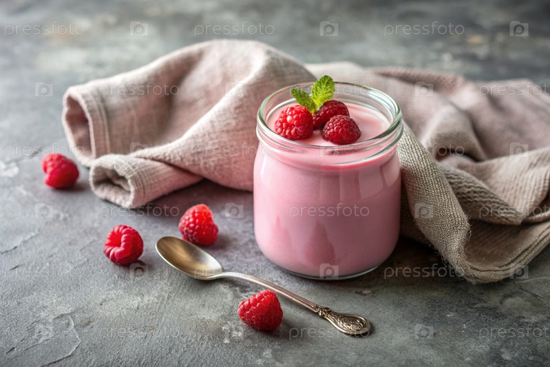 Домашний малиновый йогурт со свежими малинами, винтажной ложкой и полотенцем на стильном сером фоне