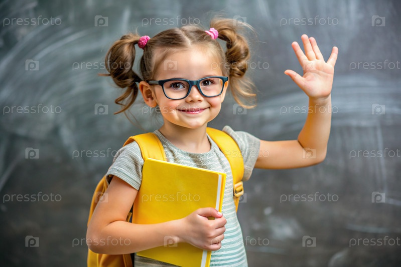 Красивая девушка в очках показывает класс своей рукой. Ребенок идет в школу впервые. Ребёнок с школьной сумкой и книгой. Ребенок в классе со доской на заднем плане. Назад в школу