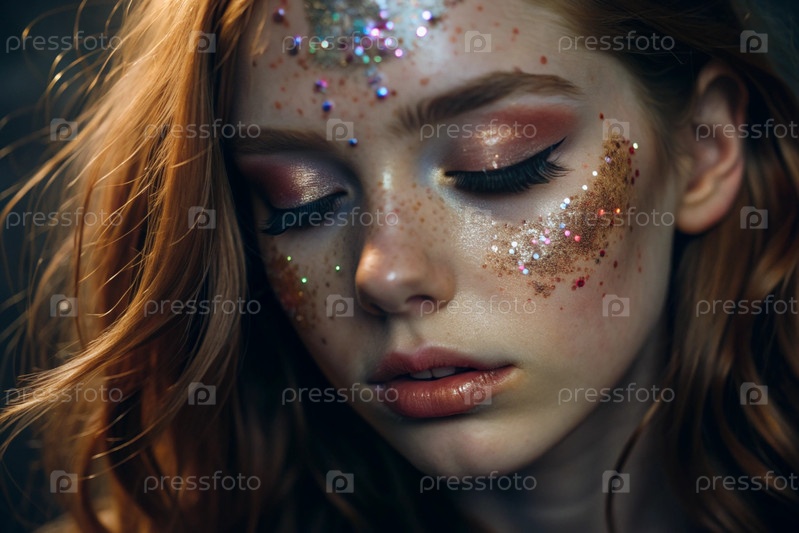 Покрытие лица девушки праздничным макияжем и ленточками.Изображение придает ей сказочный и мистический вид.Концепция новогодней ночи или дня рождения