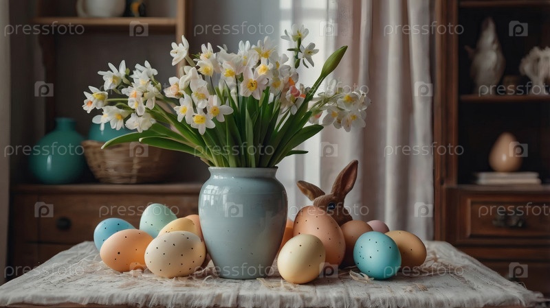 Концепция яркого пасхального праздника. Ретро интерьер дома с пасхальным декором. Весенние цветы в белой вазе и пасхальные яйца в пастельных оттенках