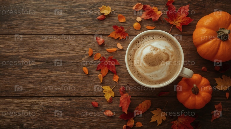Вкусное тыквенное латте в кружке, тыквы и осенние листья на деревянном столе. Сезонные напитки. вкусный горячий капучино. Осенний баннер