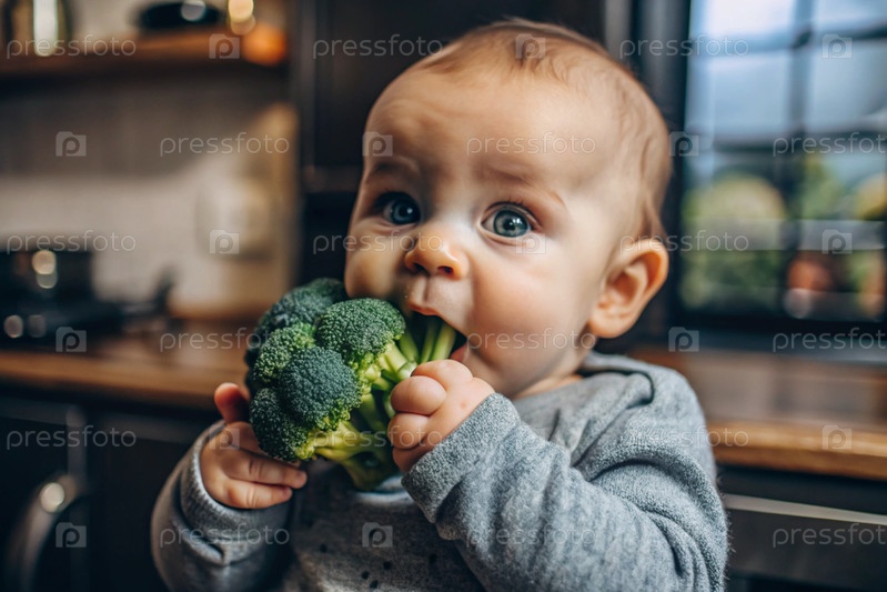 Здоровое детское питание. Первая еда. Кормить ребенка. Милый ребенок ест брокколи. Свежие овощи и фрукты