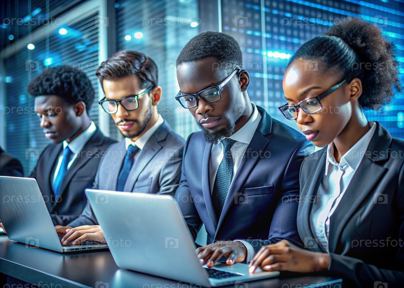 Молодые чернокожие мужчины и афроамериканки в костюмах работают в офисе за ноутбуком с цифровыми кодами на виртуальном экране