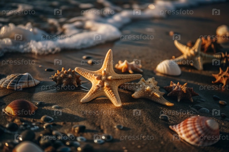 Концепция морского отдыха. Морские ракушки и морские звезды в песке у моря. История летних каникул. Копия текстового расположения