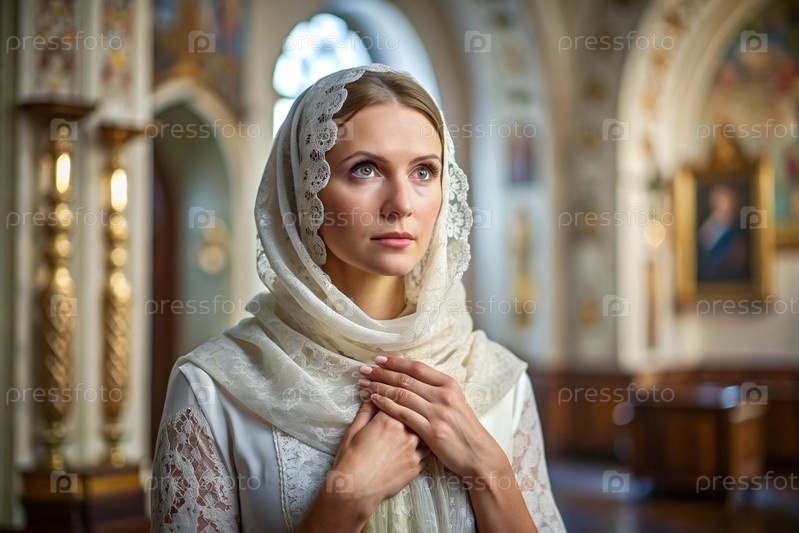 Портрет красивой молодой женщины с платками в православной церкви.Девушка молится в церкви среди икон