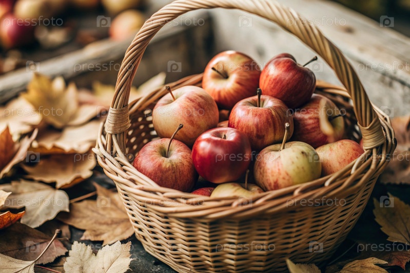 Корзина из косточки, полная свежих фруктов. корзина с красными яблоками. красивое солнечное сияние. осенний урожай, урожай или уборка