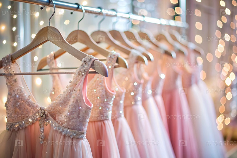 Детские вечерние пушистые светло-розовые платья висят с белых вешалок на палочке в салоне