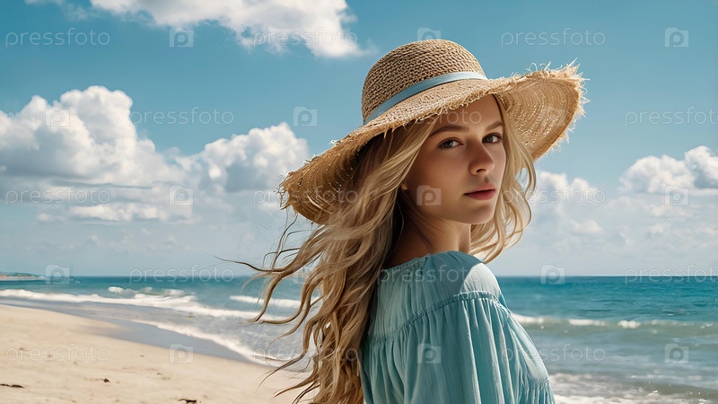 Летние каникулы на пляже, крупный план красивой женщины в соломенной шляпе.Лето. Праздники и праздники, место для копирования