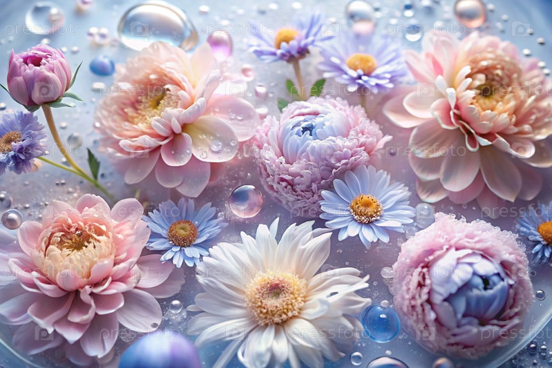 Красивый, воздушный, деликатный цветочный фон в синих и розовых тонах. цветы пиона, хризантемы, ромашки с каплями воды на лепестках