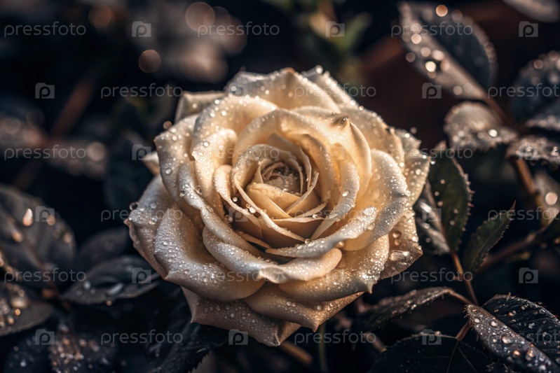 Кремовая роза красивого цвета кофе или шампанского, покрытая росой на рассвете. Красивое солнечное сияние. Фон изображения выполнен в зеленых и бежевых тонах. Естественный, экологически чистый естественный фон
