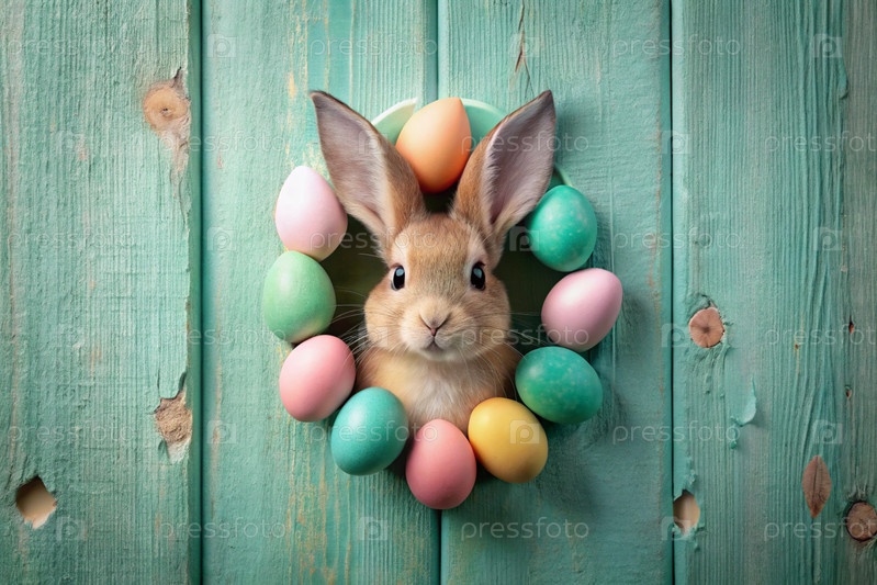 Известный праздник. милый пасхальный кролик заглядывает из ямы с красочными яйцами вокруг. концепция счастливой Пасхи