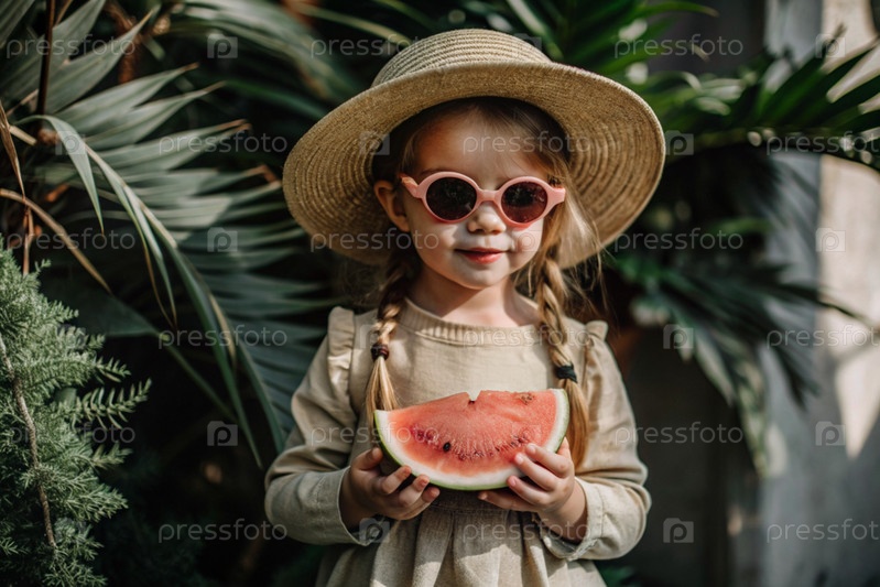 Маленькая девочка в солнцезащитных очках ест арбуз в жаркое лето. забавный счастливый ребенок с арбузом в руках. ребёнок смотрит на камеру, здоровая пища