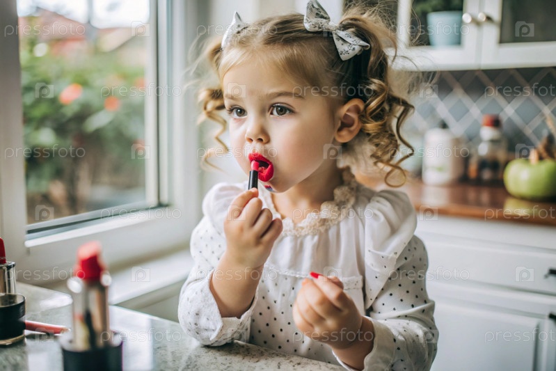 Красивая, забавная девушка в платье рисует губы красной помадой как мама.Девушка играет с женской косметикой
