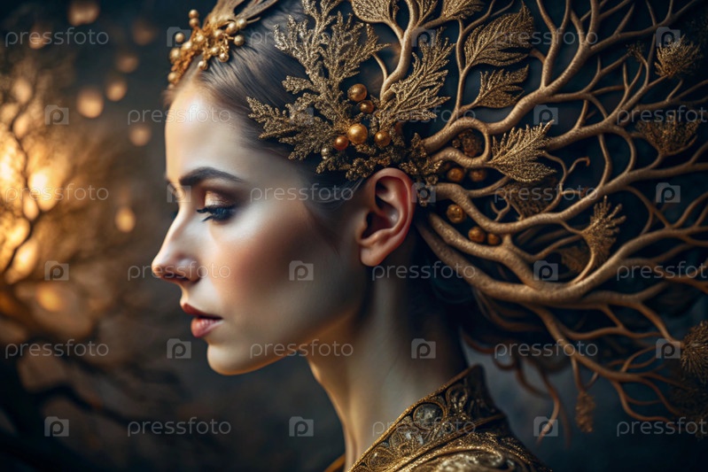 Творческий баннер для салона красоты в черно-золотом цвете. Красивая женщина, окруженная лесом с макияжем и волосами. Золотые ветви дерева в волосах. Индустрия красоты