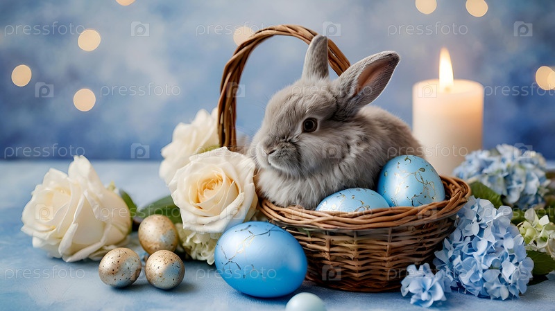 Нежные пасхальные яйца, серый кролик и голубые цветы гортензии на пастельном акварельном фоне с нежными венами