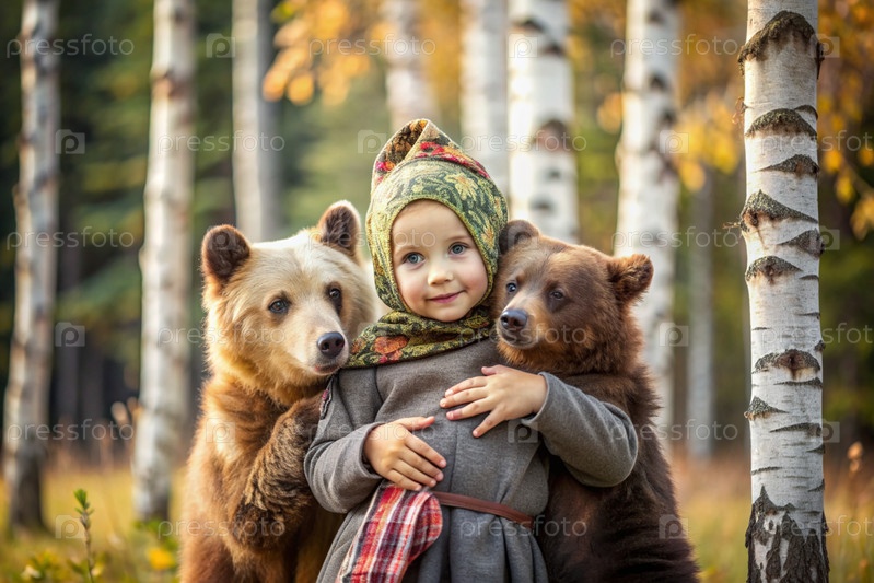 Красивая маленькая девочка в русской народной одежде и с платками на голове в березовой роще с живым медведем Русский фольклор, славянская мифология