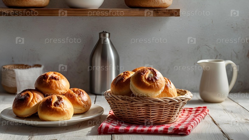 Свежие домашние выпечки на кухонном столе. свежие вкусные булочки в пекарне. свежевыпеченные мучные выпечки