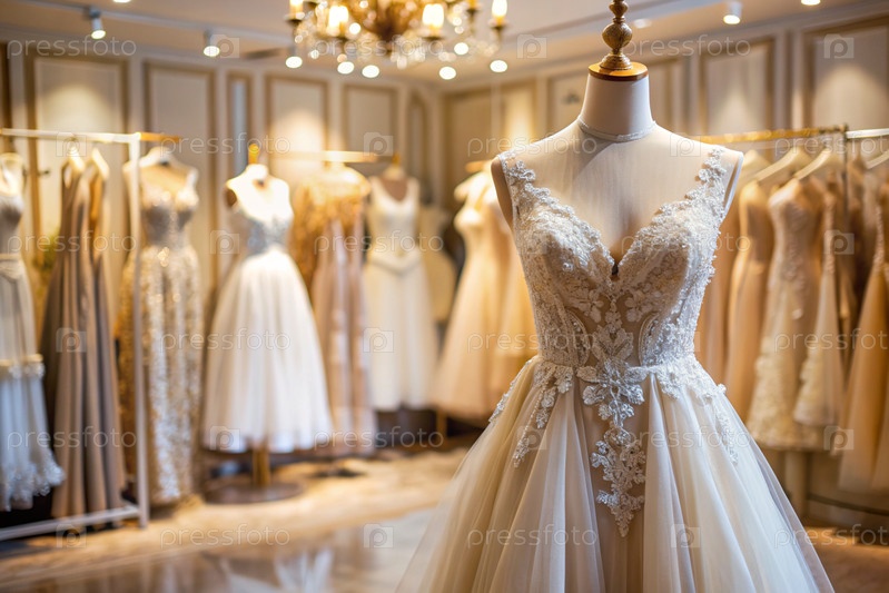Аренда и покупка свадебных платьев для мероприятий. Близкие. Элегантное белое свадебное платье на манеке в роскошном брачном салоне