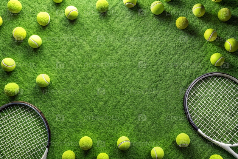 На лужайке жёлтый теннисный мяч и теннисная ракетка, летний вид спорта