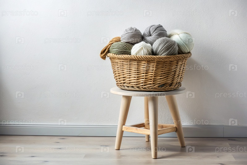 шарики пряжи в корзине из плесеня в белых и бежевых тонах швейная работа, текстиль, вязание зимний сезон, малый бизнес, ручная одежда