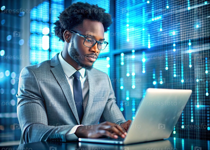 Молодой чернокожий мужчина, афроамериканец в костюме, работает в офисе за ноутбуком с цифровыми кодами на виртуальном экране